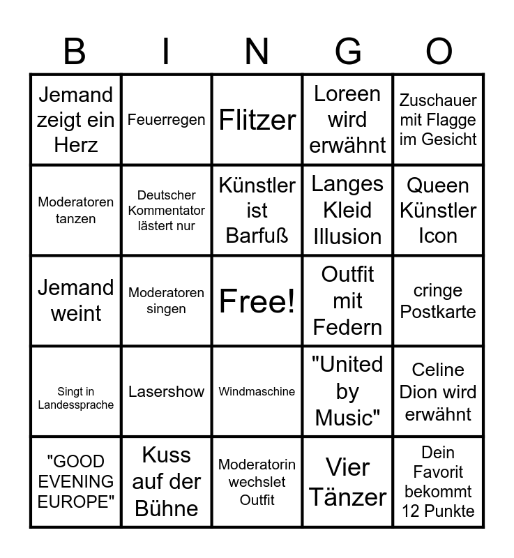 This bingo card has a free space and 24 words: Lasershow, Kuss auf der Bühne, Künstler ist Barfuß, "GOOD EVENING EUROPE", Zuschauer mit Flagge im Gesicht, Jemand zeigt ein Herz, Moderatoren tanzen, Feuerregen, Outfit mit Federn, Windmaschine, Langes Kleid Illusion, Jemand weint, "United by Music", Celine Dion wird erwähnt, Deutscher Kommentator lästert nur, Vier Tänzer, cringe Postkarte, Flitzer, Queen Künstler Icon, Moderatoren singen, Dein Favorit bekommt 12 Punkte, Singt in Landessprache, Loreen wird erwähnt and Moderatorin wechslet Outfit.
