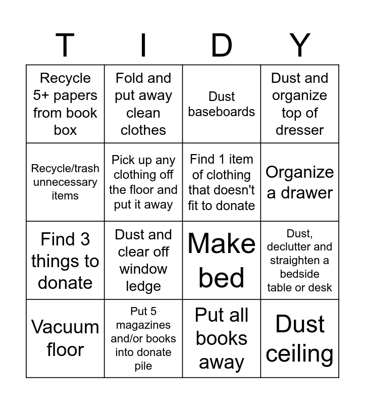 This bingo card has 16 words: Put 5 magazines and/or books into donate pile, Dust, declutter and straighten a bedside table or desk, Dust baseboards, Recycle 5+ papers from book box, Find 3 things to donate, Fold and put away clean clothes, Make bed, Put all books away, Recycle/trash unnecessary items, Pick up any clothing off the floor and put it away, Vacuum floor, Dust and organize top of dresser, Dust and clear off window ledge, Organize a drawer, Find 1 item of clothing that doesn't fit to donate and Dust ceiling.