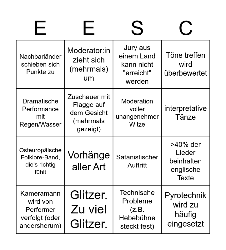 This bingo card has 16 words: Glitzer. Zu viel Glitzer., >40% der Lieder beinhalten englische Texte, Jury aus einem Land kann nicht "erreicht" werden, Nachbarländer schieben sich Punkte zu, Osteuropäische Folklore-Band, die's richtig fühlt, Moderator:in zieht sich (mehrmals) um, Satanistischer Auftritt, Technische Probleme (z.B. Hebebühne steckt fest), Dramatische Performance mit Regen/Wasser, Zuschauer mit Flagge auf dem Gesicht (mehrmals gezeigt), Kameramann wird von Performer verfolgt (oder andersherum), Töne treffen wird überbewertet, Vorhänge aller Art, interpretative Tänze, Moderation voller unangenehmer Witze and Pyrotechnik wird zu häufig eingesetzt.