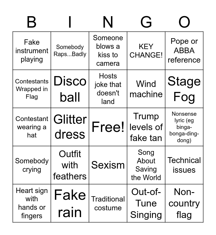 This bingo card has a free space and 41 words: A song about love, Contestant wearing a hat, Costume change mid-act, Disco ball, Fake rain, Sexism, Hosts joke that doesn't land, Missed high note, Pope or ABBA reference, Somebody crying, Glitter dress, KEY CHANGE!, Non-country flag, Nonsense lyric (eg binga-bonga-ding-dong), Trump levels of fake tan, Outfit with feathers, Performer appears barefoot, Fake instrument playing, Pyrotechnics, Someone blows a kiss to camera, Technical issues, Topless male dancer, Traditional costume, Wind machine, Embarrassing moment, Ridiculous Competitor Name, Out-of-Tune Singing, Mini-Flag Waving, Stage Fog, Praying to Camera for Votes, Contestants Hug After Performance, Somebody Raps...Badly, Heart sign with hands or fingers, Ballad with Ethnic Instruments, Song About Saving the World, Contestants Wrapped in Flag, Flag Face Painting, Singer Kneels on Stage, “Good Evening Europe”, Over-Eager Backing Dancers and Performer in Sunglasses.