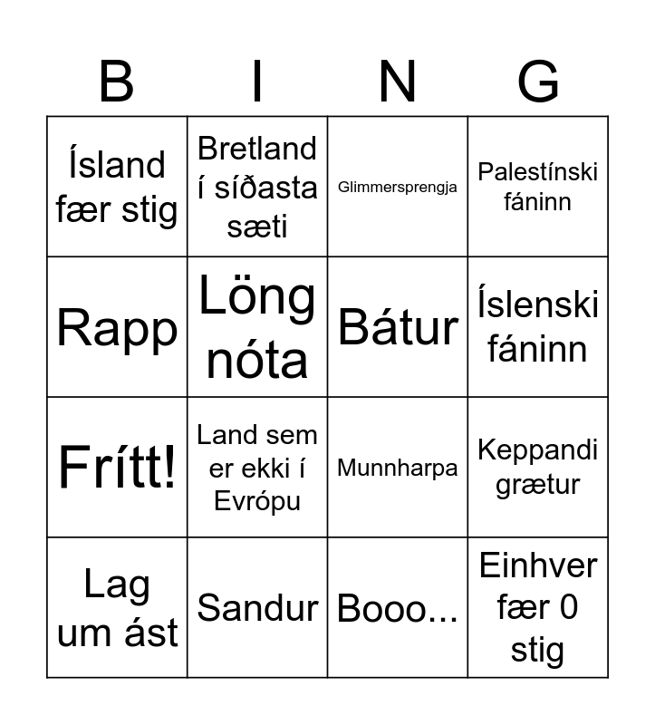 This bingo card has 20 words: Keppandi grætur, Eldur, Glimmersprengja, Fataskipti, Lag um ást, Rapp, Sandur, Ísland fær stig, Frítt!, Bretland í síðasta sæti, Land sem er ekki í Evrópu, Munnharpa, Löng nóta, Einhver fær 0 stig, Bátur, Leðurbúningur, Íslenski fáninn, Palestínski fáninn, Booo... and Minnst á Celine Dion.