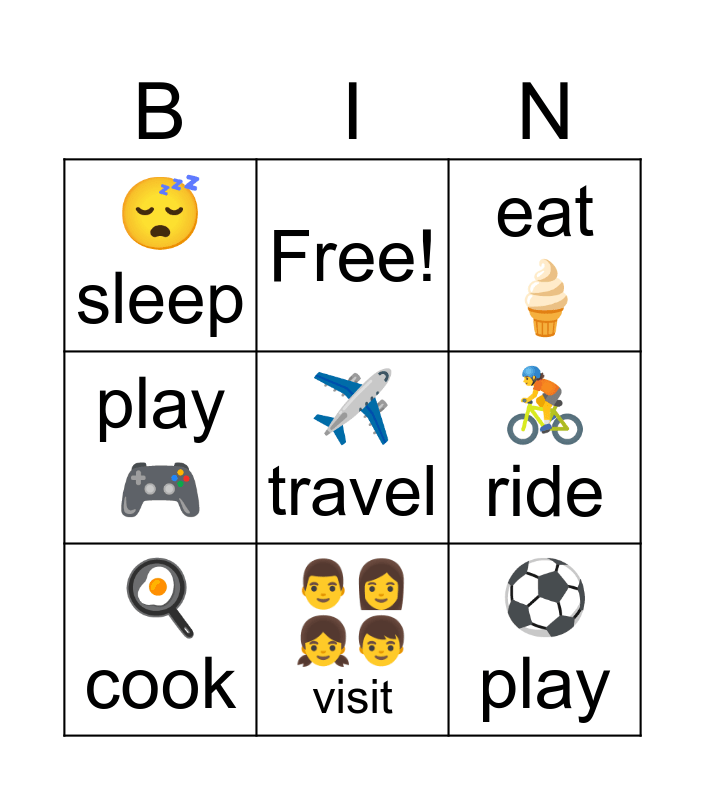 This bingo card has 12 words: ๐๏ธ go to the beach, โฝ play, โ๏ธ travel, ๐ด ride, Free!, eat๐ฆ, ๐จ๐ฉ๐ง๐ฆ visit, ๐ธ take photos, ๐ด sleep, play๐ฎ, ๐ณ cook and ๐ swim.