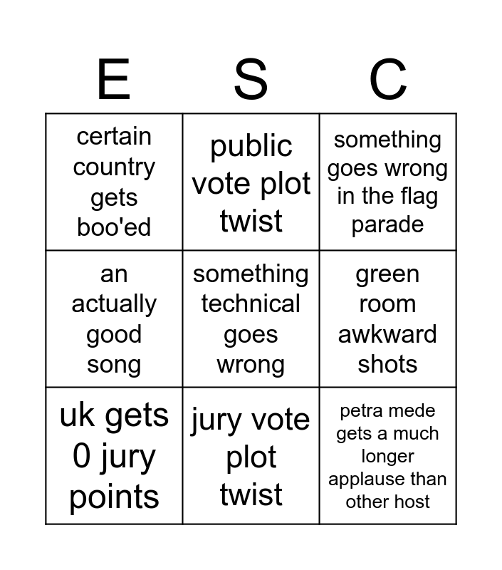 This bingo card has 18 words: awkward interaction with audience member, gilmore girls reference, something goes wrong in the flag parade, certain country gets boo'ed, awkward martin osterdahl-related skit, an actually good song, a meme song, public vote plot twist, jury vote plot twist, petra mede gets a much longer applause than other host, someone's holding a banned flag, something technical goes wrong, emotional greenroom scene, green room awkward shots, uk gets 0 jury points, uk gets 0 public points, weird switzerland related skit or song and borderline product placement.