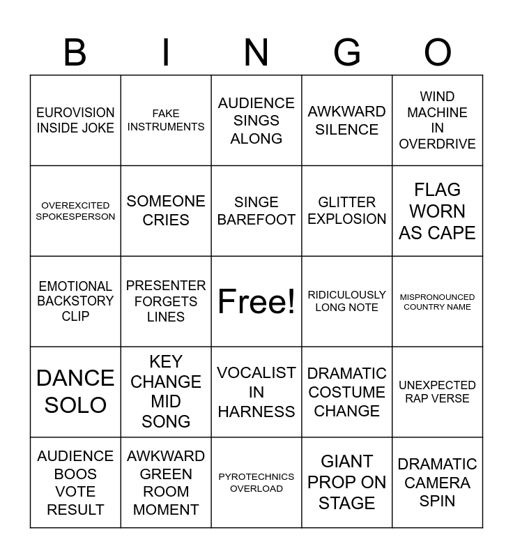 This bingo card has a free space and 24 words: KEY CHANGE MID SONG, AWKWARD GREEN ROOM MOMENT, SINGE BAREFOOT, AUDIENCE BOOS VOTE RESULT, WIND MACHINE IN OVERDRIVE, EUROVISION INSIDE JOKE, OVEREXCITED SPOKESPERSON, FAKE INSTRUMENTS, RIDICULOUSLY LONG NOTE, VOCALIST IN HARNESS, GLITTER EXPLOSION, EMOTIONAL BACKSTORY CLIP, DRAMATIC COSTUME CHANGE, UNEXPECTED RAP VERSE, SOMEONE CRIES, GIANT PROP ON STAGE, MISPRONOUNCED COUNTRY NAME, AUDIENCE SINGS ALONG, FLAG WORN AS CAPE, PRESENTER FORGETS LINES, DRAMATIC CAMERA SPIN, DANCE SOLO, AWKWARD SILENCE and PYROTECHNICS OVERLOAD.