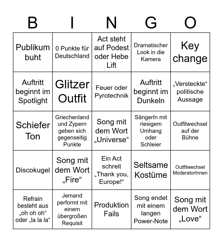 This bingo card has 36 words: Free!, Windmaschine, Übertriebene Nebelmaschine, Glitzer Outfit, Seltsame Kostüme, Discokugel, Feuer oder Pyrotechnik, Wasser auf der Bühne, Key change, LED-Boden Effekt, Griechenland und Zypern geben sich gegenseitig Punkte, Dramatischer Look in die Kamera, Awkward Moderator Moment, SängerIn mit riesigem Umhang oder Schleier, „Versteckte“ politische Aussage, Publikum buht, Song mit dem Wort „Love“, Song mit dem Wort „Fire“, Song mit dem Wort „Universe“, Act steht auf Podest oder Hebe Lift, Outfitwechsel auf der Bühne, Outfitwechsel ModeratorInnen, Jemand performt mit einem übergroßen Requisit, Refrain besteht aus „oh oh oh“ oder „la la la“, Produktion Fails, 0 Punkte für Deutschland, Schiefer Ton, Jury und Publikums sind sich komplett uneinig, Auftritt beginnt im Dunkeln, Auftritt beginnt im Spotlight, Kamera fährt im Kreis um die Sänger:in, Sänger:in liegt oder kniet auf der Bühne, Song endet mit einem langen Power-Note, Ein Act schreit „Thank you, Europe!“, Pride Flag and Felix braucht seine Kapuze.