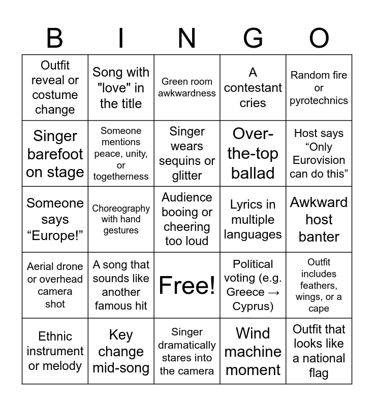 This bingo card has 26 words: Free!, Wind machine moment, Singer wears sequins or glitter, Key change mid-song, Random fire or pyrotechnics, Outfit reveal or costume change, Singer barefoot on stage, Song with "love" in the title, Awkward host banter, Political voting (e.g. Greece → Cyprus), Over-the-top ballad, Someone says “Europe!”, Outfit includes feathers, wings, or a cape, Ethnic instrument or melody, Choreography with hand gestures, Someone raps (badly), A contestant cries, Aerial drone or overhead camera shot, Green room awkwardness, Audience booing or cheering too loud, Host says “Only Eurovision can do this”, Singer dramatically stares into the camera, Lyrics in multiple languages, A song that sounds like another famous hit, Someone mentions peace, unity, or togetherness and Outfit that looks like a national flag.
