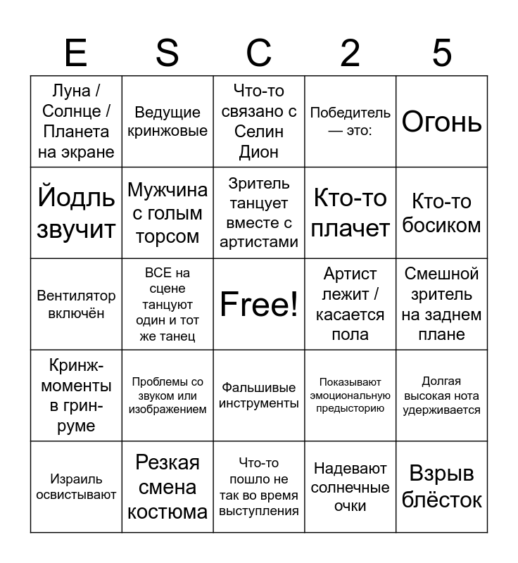 This bingo card has a free space and 24 words: Проблемы со звуком или изображением, Резкая смена костюма, Зритель танцует вместе с артистами, Израиль освистывают, Огонь, Луна / Солнце / Планета на экране, Йодль звучит, Ведущие кринжовые, Артист лежит / касается пола, Фальшивые инструменты, Кто-то плачет, Вентилятор включён, Показывают эмоциональную предысторию, Долгая высокая нота удерживается, Мужчина с голым торсом, Надевают солнечные очки, Смешной зритель на заднем плане, Что-то связано с Селин Дион, Кто-то босиком, ВСЕ на сцене танцуют один и тот же танец, Взрыв блёсток, Кринж-моменты в грин-руме, Победитель — это: and Что-то пошло не так во время выступления.