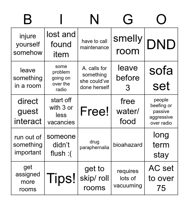 This bingo card has a free space and 24 words: someone didn’t flush :(, Tips!, A. calls for something she could’ve done herself, get assigned more rooms, DND, injure yourself somehow, leave something in a room, lost and found item, free water/ food, drug paraphernalia, leave before 3, direct guest interact, bioahazard, long term stay, some problem going on over the radio, requires lots of vacuuming, people beefing or passive aggressive over radio, have to call maintenance, sofa set, start off with 3 or less vacancies, AC set to over 75, run out of something important, smelly room and get to skip/ roll rooms.