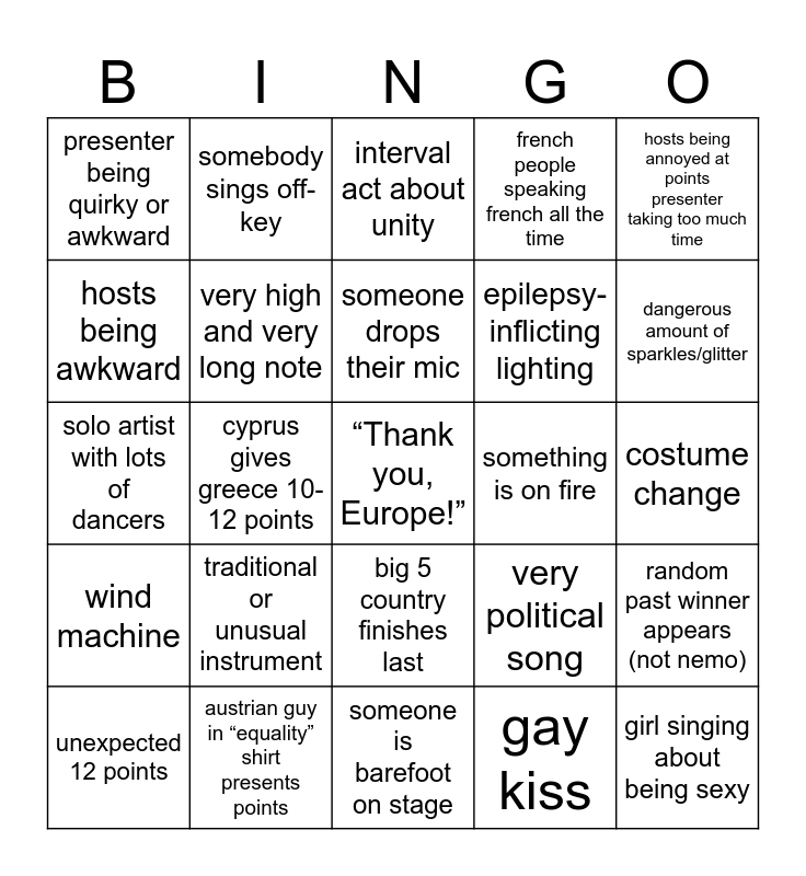 This bingo card has a free space and 24 words: traditional or unusual instrument, austrian guy in “equality” shirt presents points, someone drops their mic, unexpected 12 points, hosts being annoyed at points presenter taking too much time, presenter being quirky or awkward, hosts being awkward, somebody sings off-key, something is on fire, big 5 country finishes last, epilepsy-inflicting lighting, solo artist with lots of dancers, very political song, random past winner appears (not nemo), very high and very long note, gay kiss, costume change, interval act about unity, dangerous amount of sparkles/glitter, cyprus gives greece 10-12 points, girl singing about being sexy, wind machine, french people speaking french all the time and someone is barefoot on stage.