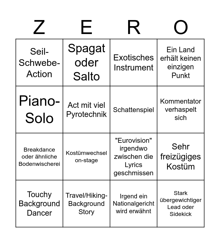 This bingo card has 20 words: Sehr freizügiges Kostüm, Richtig dämlicher Hut, Exotisches Instrument, Epileptische Scheinwerfer-Einlage, Touchy Background Dancer, Piano-Solo, Travel/Hiking-Background Story, Seil-Schwebe-Action, Breakdance oder ähnliche Bodenwischerei, Spagat oder Salto, Kostümwechsel on-stage, "Eurovision" irgendwo zwischen die Lyrics geschmissen, Act mit viel Pyrotechnik, Stark übergewichtiger Lead oder Sidekick, Schattenspiel, Mann/Frau-Duett ohne Background Actors, Kommentator verhaspelt sich, Ein Land erhält keinen einzigen Punkt, Irgend ein Nationalgericht wird erwähnt and Kommentatoren dissen sich.