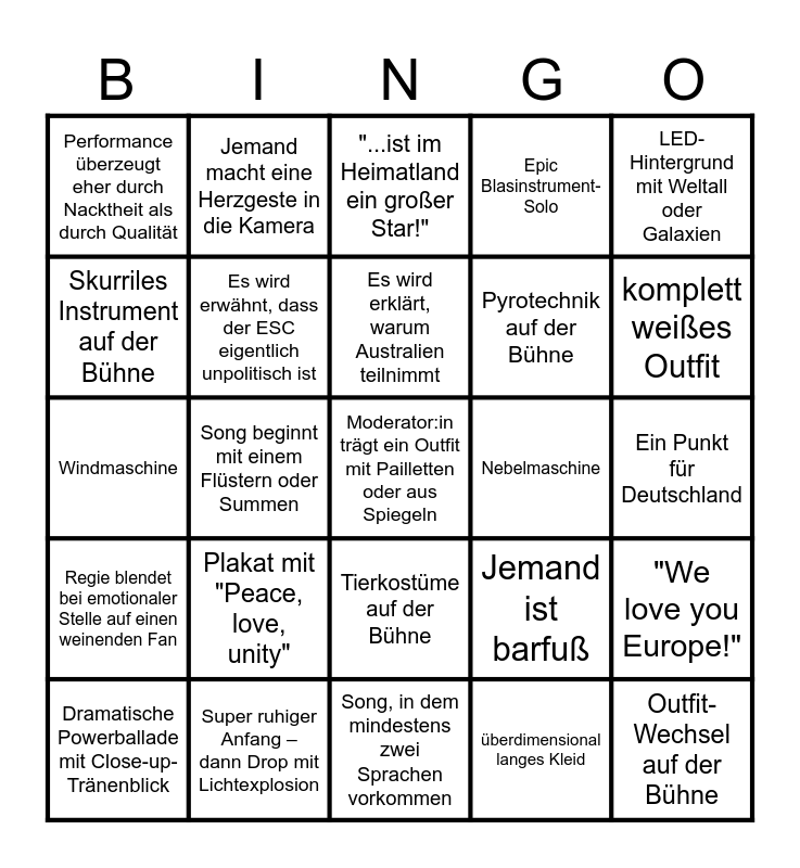 This bingo card has 25 words: Plakat mit "Peace, love, unity", Song, in dem mindestens zwei Sprachen vorkommen, Es wird erklärt, warum Australien teilnimmt, Dramatische Powerballade mit Close-up-Tränenblick, LED-Hintergrund mit Weltall oder Galaxien, Performance überzeugt eher durch Nacktheit als durch Qualität, Skurriles Instrument auf der Bühne, Jemand macht eine Herzgeste in die Kamera, Nebelmaschine, Tierkostüme auf der Bühne, Pyrotechnik auf der Bühne, Windmaschine, Jemand ist barfuß, "We love you Europe!", Es wird erwähnt, dass der ESC eigentlich unpolitisch ist, Outfit-Wechsel auf der Bühne, Ein Punkt für Deutschland, "...ist im Heimatland ein großer Star!", komplett weißes Outfit, Song beginnt mit einem Flüstern oder Summen, Moderator:in trägt ein Outfit mit Pailletten oder aus Spiegeln, Super ruhiger Anfang – dann Drop mit Lichtexplosion, Regie blendet bei emotionaler Stelle auf einen weinenden Fan, Epic Blasinstrument-Solo and überdimensional langes Kleid.