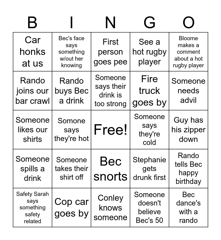 This bingo card has a free space and 24 words: Someone takes their shirt off, Cop car goes by, Someone says their drink is too strong, Safety Sarah says something safety related, Bloome makes a comment about a hot rugby player, Car honks at us, Rando joins our bar crawl, Bec's face says something w/out her knowing, Someone says they're cold, Bec snorts, Fire truck goes by, Someone likes our shirts, Stephanie gets drunk first, Rando tells Bec happy birthday, Rando buys Bec a drink, Someone doesn't believe Bec's 50, Guy has his zipper down, First person goes pee, Someone needs advil, Somone says they're hot, Bec dance's with a rando, Someone spills a drink, See a hot rugby player and Conley knows someone.