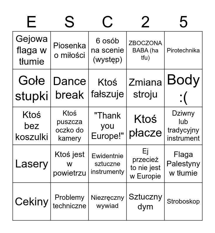 This bingo card has a free space and 24 words: Ktoś jest w powietrzu, Problemy techniczne, Ktoś fałszuje, Cekiny, Pirotechnika, Gejowa flaga w tłumie, Gołe stupki, Piosenka o miłości, Ktoś płacze, Ewidentnie sztuczne instrumenty, Zmiana stroju, Ktoś bez koszulki, Ej przecież to nie jest w Europie, Flaga Palestyny w tłumie, Dance break, Sztuczny dym, Dziwny lub tradycyjny instrument, 6 osób na scenie (występ), Body :(, Ktoś puszcza oczko do kamery, Stroboskop, Lasery, ZBOCZONA BABA (ha tfu) and Niezręczny wywiad.