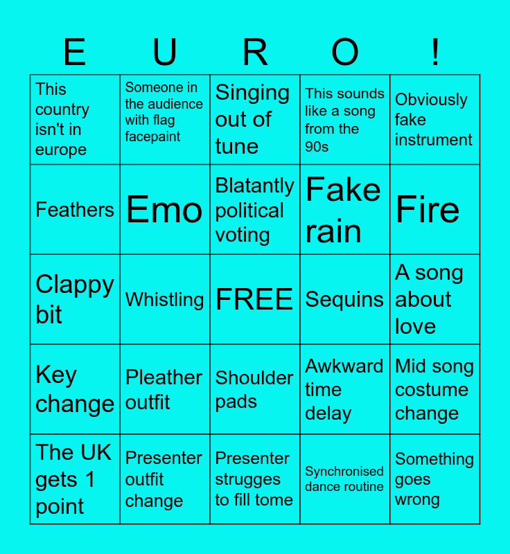 This bingo card has a free space and 33 words: Nil Points, Anybody raps, Whistling, Someone wearing a hat, Key change, Emo, Obviously fake instrument, The UK gets 1 point, Someone in the audience with flag facepaint, Wind machine, Blatantly political voting, Singing out of tune, Glitter cannon, Winking at the camera, Sequins, Fire, Presenter outfit change, Clappy bit, Pleather outfit, Awkward time delay, Shoulder pads, Booing, This country isn't in europe, A song about love, Presenter strugges to fill tome, Something goes wrong, This sounds like a song from the 90s, Fake rain, Feathers, Mid song costume change, Contestant cries happy tears, Synchronised dance routine and Dragon.