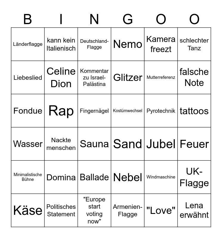 This bingo card has 65 words: Liegt am Boden, Windmaschine, Nippelflitzer, Nackte menschen, Domina, kann kein englisch, kann kein Italienisch, Witz von Andi Knoll, Celine Dion, EBU erwähnt, tattoos, "Trinkspiel", Fingernägel, Kamera freezt, komische Kameraeinstellung, schlechter Tanz, falsche Note, Länderflagge, Free!, Kommentar zu Israel-Palästina, Pyrotechnik, Kostümwechsel, Nemo, Käse, Hazel Brugger, "Love", "Europe start voting now", "Europe stop voting now", Fondue, Basel, Sauna, Schnurrbart, komische Schuhe, LED-Show, Wasser, Sand, Duett, Mutterreferenz, Feuer, Lena erwähnt, Liebeslied, Ballade, Rap, fake tränen, Deutschland wird letzter, Politisches Statement, Glitzer, Pailletten, Minimalistische Bühne, Nebel, Flaggen, Österreich-Flagge, Auspfeifen, Jubel, Schweigen, Ton spackt, "Nestland", Deutschland-Flagge, UK-Flagge, Armenien-Flagge, Deutschland null Punkte, "12 Points", "0 Points", weißes Outfit and dreck auf der Bühne.