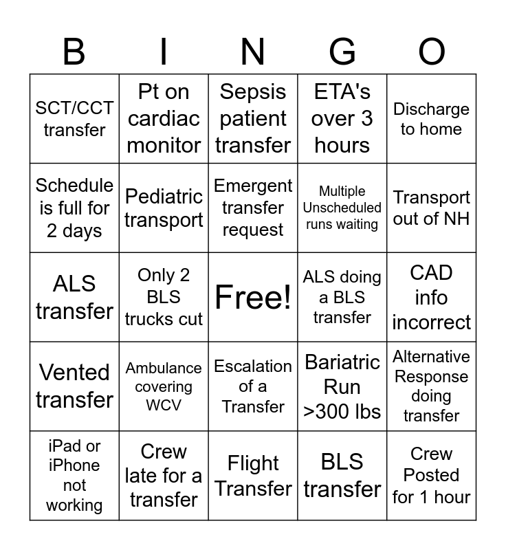This bingo card has a free space and 34 words: Request lift assist, BLS transfer, Stretcher issues, Transport got crew out late, Vented transfer, Pediatric transport, Discharge to home, iPad or iPhone not working, Pt on cardiac monitor, Crew late for scheduled call, Emergent transfer request, Sepsis patient transfer, Run canceled, Called an "ambulance driver", ALS doing a BLS transfer, Transport out of NH, Crew late for a transfer, ALS transfer, Ambulance covering WCV, Bariatric Run >300 lbs, Escalation of a Transfer, Paperwork not ready, SCT/CCT transfer, CAD info incorrect, Flight Transfer, Crew Posted for 1 hour, ETA's over 3 hours, Tablet or Computer not working, Multiple Unscheduled runs waiting, Schedule is full for 2 days, Critical care doing 911 call, Only 2 BLS trucks cut, Alternative Response doing transfer and This run is for tomorrow.