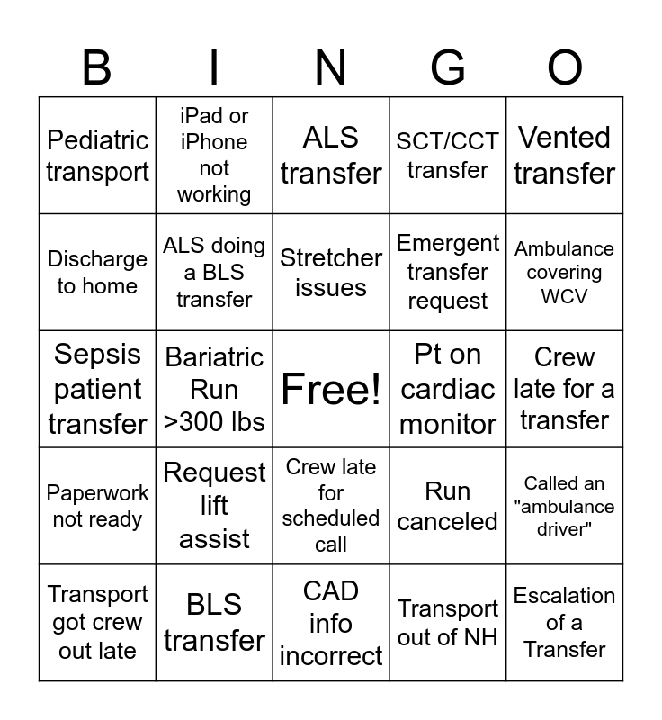 This bingo card has a free space and 24 words: Request lift assist, BLS transfer, Stretcher issues, Transport got crew out late, Vented transfer, Pediatric transport, Discharge to home, iPad or iPhone not working, Pt on cardiac monitor, Crew late for scheduled call, Emergent transfer request, Sepsis patient transfer, Run canceled, Called an "ambulance driver", ALS doing a BLS transfer, Transport out of NH, Crew late for a transfer, ALS transfer, Ambulance covering WCV, Bariatric Run >300 lbs, Escalation of a Transfer, Paperwork not ready, SCT/CCT transfer and CAD info incorrect.