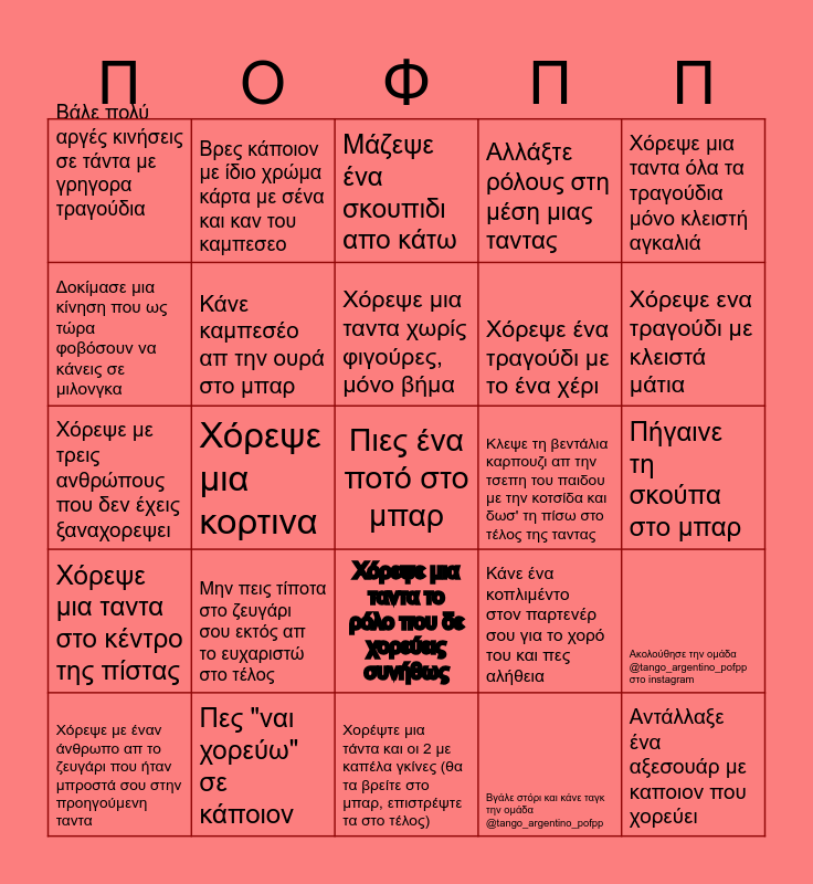 This bingo card has a free space and 35 words: Χόρεψε με καποιον με μπλε μπλούζα, Χόρεψε όλες τις μιλονγκες, Χόρεψε μια ταντα με κάποιον απ το κοινό που δεν ξέρει τάνγκο, Κάνε καμπεσέο απ την ουρά στο μπαρ, Χόρεψε μια ταντα το ρόλο που δε χορεύεις συνήθως, Αλλάξτε ρόλους στη μέση μιας ταντας, Δοκίμασε μια κίνηση που ως τώρα φοβόσουν να κάνεις σε μιλονγκα, Κάνε καμπεσεο από την άλλη άκρη της πίστας, Χόρεψε μια ταντα χωρίς φιγούρες, μόνο βήμα, Χόρεψε 3 απ τα 4 βαλς (γκετ ιτ;), Χόρεψε με τρεις ανθρώπους που δεν έχεις ξαναχορεψει, Χόρεψε μια ταντα όλα τα τραγούδια μόνο κλειστή αγκαλιά, Ολοκλήρωσε μια ταντα χωρίς κανένα τρακάρισμα με άλλα ζευγάρι, Ντράιβ μπαη καμπεσεο (κάνε καμπεσέο εν κινήσει), Βάλε πολύ αργές κινήσεις σε τάντα με γρηγορα τραγούδια, Κλεψε τη βεντάλια καρπουζι απ την τσεπη του παιδου με την κοτσίδα και δωσ' τη πίσω στο τέλος της ταντας, Βγάλε στόρι και κάνε ταγκ την ομάδα @tango_argentino_pofpp, Χόρεψε μια κορτινα, Χόρεψε μια ταντα στο κέντρο της πίστας, Αντάλλαξε ένα αξεσουάρ με καποιον που χορεύει, Κάνε ένα κοπλιμέντο στον παρτενέρ σου για το χορό του και πες αλήθεια, Χόρεψε με έναν άνθρωπο απ το ζευγάρι που ήταν μπροστά σου στην προηγούμενη ταντα, Ακολούθησε την ομάδα @tango_argentino_pofpp στο instagram, Πες "ναι χορεύω" σε κάποιον, Μάζεψε ένα σκουπιδι απο κάτω, Χόρεψε ενα τραγούδι με κλειστά μάτια, Μία τάντα με τρεις να χορεύουν μαζί, Χόρεψε μ' ένα ποτήρι στο χέρι, Χόρεψε ένα τραγούδι με το ένα χέρι, Πήγαινε τη σκούπα στο μπαρ, Χόρεψε μια τάντα με γυαλιά ηλίου, Χορέψτε μια τάντα και οι 2 με καπέλα γκίνες (θα τα βρείτε στο μπαρ, επιστρέψτε τα στο τέλος), Μην πεις τίποτα στο ζευγάρι σου εκτός απ το ευχαριστώ στο τέλος, Βρες κάποιον με ίδιο χρώμα κάρτα με σένα και καν του καμπεσεο and Χόρεψε με καποιον με άσπρη μπλούζα.