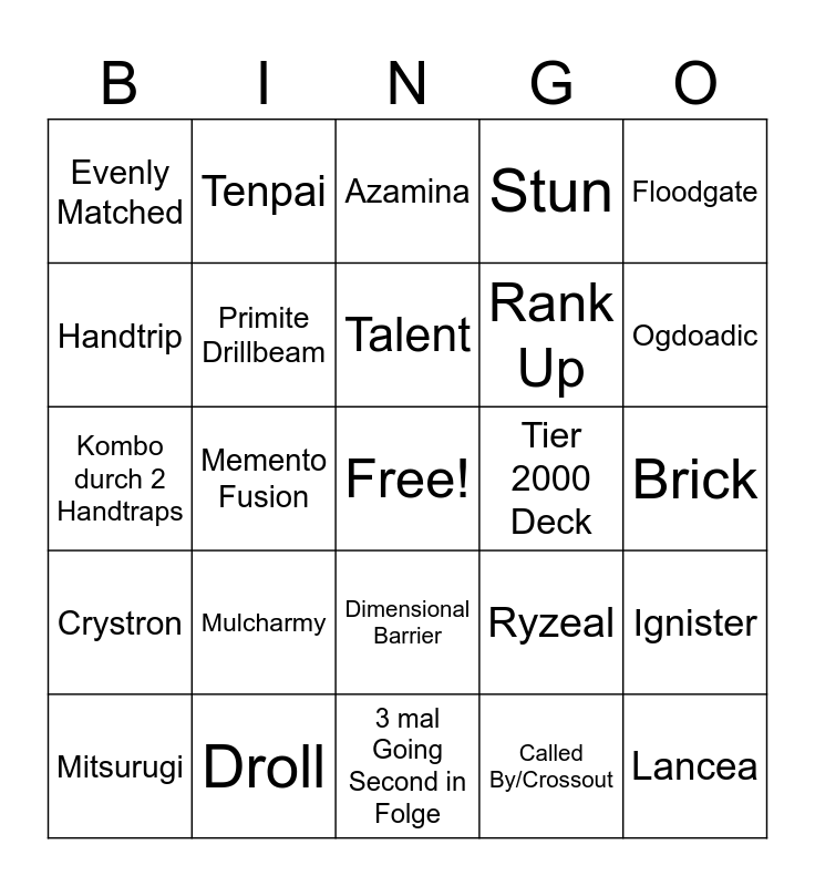 This bingo card has a free space and 24 words: Mulcharmy, Droll, Talent, Mitsurugi, Floodgate, Evenly Matched, Handtrip, Tenpai, Tier 2000 Deck, Dimensional Barrier, Rank Up, Kombo durch 2 Handtraps, Ryzeal, Ignister, Primite Drillbeam, Called By/Crossout, Brick, Azamina, Ogdoadic, Memento Fusion, Lancea, Crystron, Stun and 3 mal Going Second in Folge.