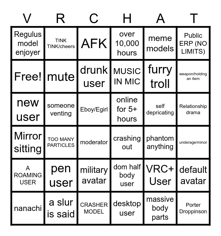 This bingo card has 36 words: Mirror sitting, TOO MANY PARTICLES, CRASHER MODEL, MUSIC IN MIC, self depricating, Relationship drama, Regulus model enjoyer, a slur is said, AFK, dom half body user, furry troll, Public ERP (NO LIMITS), A ROAMING USER, someone venting, drunk user, over 10,000 hours, VRC+ User, underage/minor, Free!, mute, moderator, crashing out, phantom anything, default avatar, new user, TINK TINK/cheers, Eboy/Egirl, desktop user, meme models, weapon/holding an item, nanachi, pen user, military avatar, online for 5+ hours, massive body parts and Porter Droppinson.