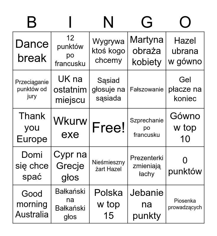 This bingo card has a free space and 24 words: Cypr na Grecje głos, Bałkański na Bałkański głos, Sąsiad głosuje na sąsiada, Good morning Australia, Hazel ubrana w gówno, Dance break, Przeciąganie punktów od jury, 12 punktów po francusku, Szprechanie po francusku, Nieśmieszny żart Hazel, Fałszowanie, Thank you Europe, Prezenterki zmieniają łachy, 0 punktów, UK na ostatnim miejscu, Jebanie na punkty, Gówno w top 10, Wygrywa ktoś kogo chcemy, Gel płacze na koniec, Wkurw exe, Piosenka prowadzących, Domi się chce spać, Martyna obraża kobiety and Polska w top 15.