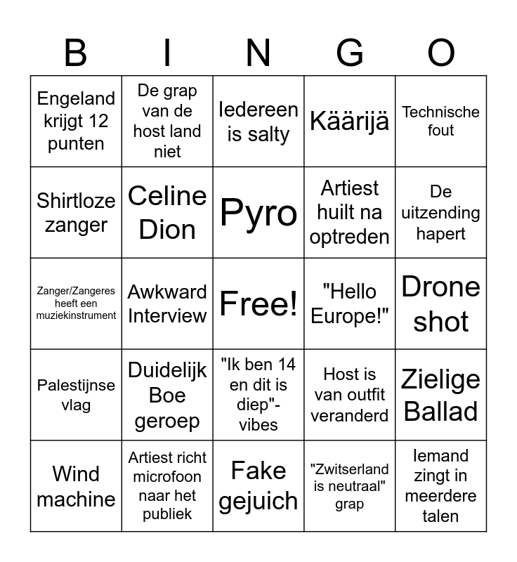 This bingo card has a free space and 47 words: "Thank you Europe!", Iemand zingt in meerdere talen, Iemand zingt in een taal die niet uit zijn/haar eigen land komt, Fake gejuich, Duidelijk Boe geroep, Gigantische props, De grap van de host land niet, Ai, Shirtloze zanger, Cornald Maas is salty, Celine Dion, Käärijä, Zielige Ballad, Host is van outfit veranderd, Raar camera effect, Te lang durende wide-shot, Pyro, "Hello Europe!", Iemand probeert zwitsers te praten en faalt, Technische fout, Awkward Interview, "Zwitserland is neutraal" grap, Engeland krijgt 12 punten, Artiest huilt na optreden, Random dance break, De uitzending hapert, Wind machine, Vage politieke statement, "Ik ben 14 en dit is diep"-vibes, Palestijnse vlag, Kleding wissel in de act, liedje heeft een keychange, Overduidelijk Politiek gestemd, Geboe bij Martin Österdahl, Een liedje over Vrede, Artiest richt microfoon naar het publiek, Drone shot, Lange hoge noot, Vals gezongen, Roderik is salty, Bob is salty, Iedereen is salty, Zanger/Zangeres heeft een muziekinstrument, Iemand speelt piano, Land eindigt met 0 punten, Super over-the-top outfit and Eurovisie feitje van Alexander.