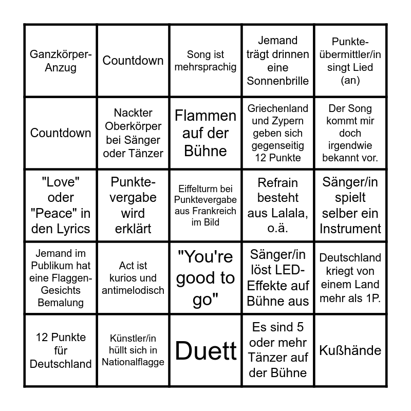 This bingo card has 50 words: Moderator/in hat sich umgezogen, Künstler/in hüllt sich in Nationalflagge, Traditionelles Kostüm / Tracht, LED-Kostüm, Sänger/in spielt selber ein Instrument, Gesang am Klavier, Countdown, Handherzen für die Zuschauer, Griechenland und Zypern geben sich gegenseitig 12 Punkte, Nebel auf der Bühne, Ganzkörper- Anzug, Nackter Oberkörper bei Sänger oder Tänzer, Eiffelturm bei Punktevergabe aus Frankreich im Bild, Es sind 5 oder mehr Tänzer auf der Bühne, "Europe, stop voting now", Telefongeste in die Kamera, Punkte-vergabe wird erklärt, Flammen auf der Bühne, Act selbst oder die Eltern standen beim ESC schon auf der Bühne, Punkte-übermittler/in singt Lied (an), "Love" oder "Peace" in den Lyrics, Wind-maschine, Song ist mehrsprachig, Refrain besteht aus Lalala, o.ä., Akrobatik auf der Bühne, Jemand im Publikum hat eine Flaggen- Gesichts Bemalung, Act ist kurios und antimelodisch, Dem Gastgeber wird für den Abend gedankt, Jemand trägt drinnen eine Sonnenbrille, Deutschland kriegt von einem Land mehr als 1P., Im Greenroom wird angestoßen, "Good Evening Europe good morning Australia", Sänger/in ist Barfuß, Jemand sagt „Grand Prix“, Trick-Kleid, 12 Punkte für Deutschland, Outfit aus Lack und Leder, Duett, Konfetti-Regen, Der Song kommt mir doch irgendwie bekannt vor., Goldregen, Overknees, "You're good to go", Die Halle singt laut hörbar mit, Kußhände, Countdown, Trommeln, Sänger/in steht auf Podest oder ähnlichem, Sänger/in löst LED-Effekte auf Bühne aus and wie aus einem Horrorfilm.