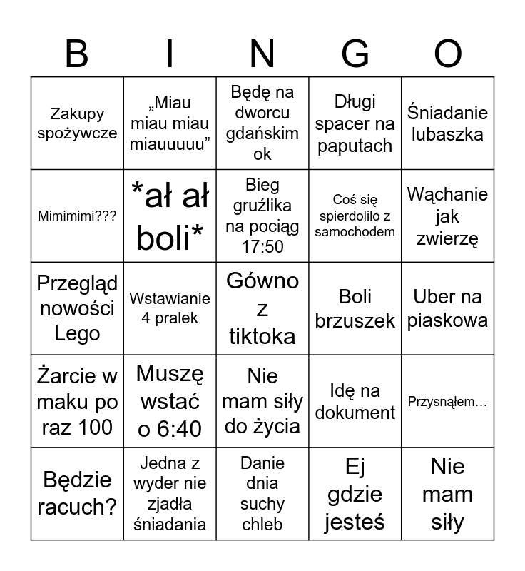 This bingo card has a free space and 24 words: Muszę wstać o 6:40, Jedna z wyder nie zjadła śniadania, Bieg gruźlika na pociąg 17:50, Będzie racuch?, Śniadanie lubaszka, Zakupy spożywcze, Mimimimi???, „Miau miau miau miauuuuu”, Boli brzuszek, Nie mam siły do życia, Coś się spierdolilo z samochodem, Przegląd nowości Lego, Idę na dokument, Przysnąłem…, *ał ał boli*, Ej gdzie jesteś, Uber na piaskowa, Będę na dworcu gdańskim ok, Wąchanie jak zwierzę, Wstawianie 4 pralek, Nie mam siły, Żarcie w maku po raz 100, Długi spacer na paputach and Danie dnia suchy chleb.
