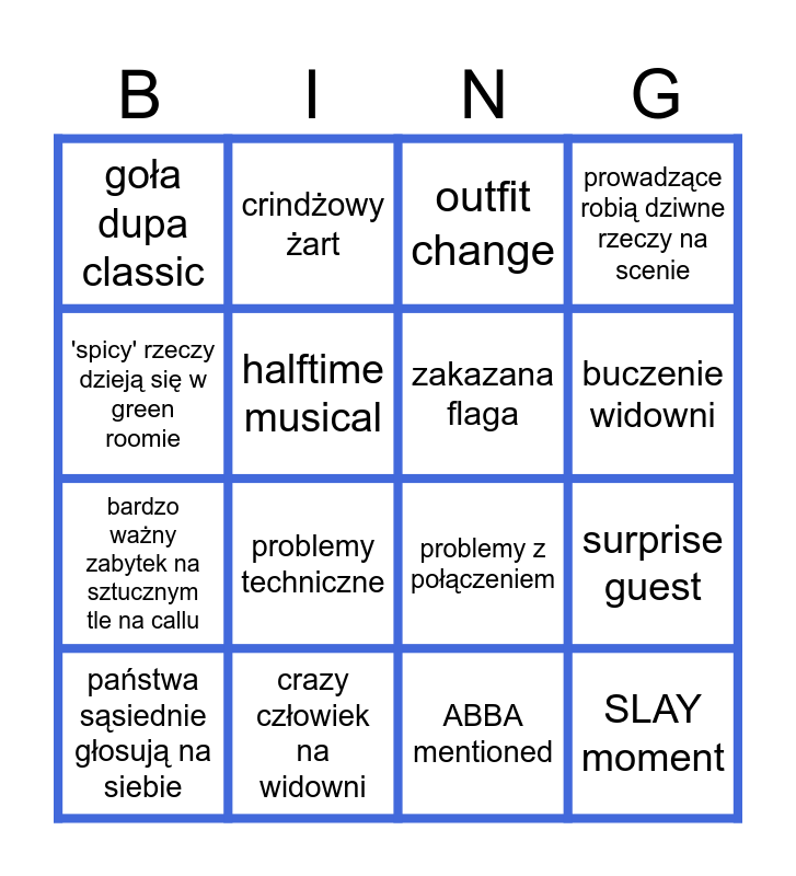 This bingo card has 16 words: crazy człowiek na widowni, surprise guest, outfit change, goła dupa classic, bardzo ważny zabytek na sztucznym tle na callu, crindżowy żart, problemy z połączeniem, ABBA mentioned, 'spicy' rzeczy dzieją się w green roomie, halftime musical, państwa sąsiednie głosują na siebie, prowadzące robią dziwne rzeczy na scenie, problemy techniczne, buczenie widowni, zakazana flaga and SLAY moment.