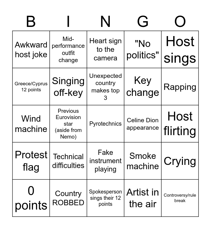This bingo card has a free space and 25 words: Technical difficulties, Spokesperson sings their 12 points, Unexpected country makes top 3, 0 points, Host sings, Awkward host joke, Greece/Cyprus 12 points, Mid-performance outfit change, Celine Dion appearance, Fake instrument playing, Key change, Wind machine, Smoke machine, Crying, Singing off-key, More than one language in a song, Host flirting, Heart sign to the camera, Rapping, Previous Eurovision star (aside from Nemo), Controversy/rule break, Country ROBBED, Protest flag, "No politics" and Artist in the air.