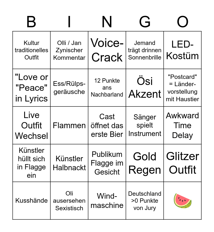 This bingo card has a free space and 24 words: Künstler Halbnackt, Oli ausersehen Sexistisch, 12 Punkte ans Nachbarland, Kusshände, LED-Kostüm, Kultur traditionelles Outfit, "Love or "Peace" in Lyrics, Olli / Jan Zynischer Kommentar, Sänger spielt Instrument, Publikum Flagge im Gesicht, Ösi Akzent, Live Outfit Wechsel, Gold Regen, Glitzer Outfit, Ess/Rülps- geräusche, Deutschland >0 Punkte von Jury, Awkward Time Delay, Voice-Crack, "Postcard" = Länder-vorstellung mit Haustier, Flammen, 🍉, Künstler hüllt sich in Flagge ein, Jemand trägt drinnen Sonnenbrille and Wind-maschine.