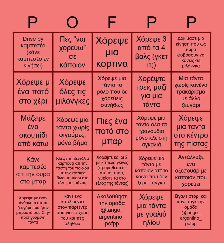 This bingo card has a free space and 36 words: Χόρεψε με καποιον με μπλε μπλούζα, Χόρεψε με καποιον με μπλε μπλούζα, Χόρεψε με καποιον με άσπρη μπλούζα, Χόρεψε όλες τις μιλόνγκες, Χόρεψε μια τάντα με κάποιον απ’ το κοινό που δεν ξέρει τάνγκο, Κάνε καμπεσέο απ την ουρά στο μπαρ, Χόρεψε μια τάντα το ρόλο που δε χορεύεις συνήθως, Αλλάξτε ρόλους στη μέση μιας τάντας, Δοκίμασε μια κίνηση που ως τώρα φοβόσουν να κάνεις σε μιλόνγκα, Κάνε καμπεσέο από την άλλη άκρη της πίστας, Χόρεψε μια τάντα χωρίς φιγούρες, μόνο βήμα, Χόρεψε 3 από τα 4 βαλς (γκετ ιτ;), Χόρεψε με τρεις ανθρώπους που δεν έχεις ξαναχορέψει, Χόρεψε μια τάντα όλα τα τραγούδια μόνο κλειστή αγκαλιά, Μια τάντα χωρίς κανένα τρακάρισμα με άλλα ζευγάρι, Drive by καμπεσέο (κάνε καμπεσέο εν κινήσει), Βάλε πολύ αργές κινήσεις σε τάντα με γρήγορα τραγούδια, Κλέψε τη βεντάλια καρπούζι απ την τσέπη του παιδιού με την κοτσίδα δωσ’ τη πίσω στο τέλος της τάντας, Βγάλε στόρι και κάνε ταγκ την ομάδα @tango_ argentino_ pofpp, Χόρεψε μια κορτινα, Χόρεψε μια ταντα στο κέντρο της πίστας, Αντάλλαξε ένα αξεσουάρ με καποιον που χορεύει, Κάνε ένα κοπλιμέντο στον παρτενέρ σου για το χορό του και πες αλήθεια, Χόρεψε με έναν άνθρωπο απ το ζευγάρι που ήταν μπροστά σου Στην προηγούμενη ταντα, Ακολούθησε την ομάδα @tango_ argentino_ pofpp, Πες "ναι χορεύω" σε κάποιον, Μάζεψε ένα σκουπίδι από κάτω, Χόρεψε ένα τραγούδι με κλειστά μάτια, Χορέψτε τρεις μαζί για μία τάντα, Χόρεψε μ ένα ποτό στο χέρι, Χόρεψε ένα τραγούδι με το ένα χέρι, Πήγαινε τη σκούπα στο μπαρ, Χόρεψε μια τάντα με γυαλιά ηλίου, Χορέψτε και οι 2 με καπέλο γκίνες (προμηθευτείτε απ’ το μπαρ, γυρίστε τα στο τέλος της τάντας), Μην πεις τίποτα στο ζευγάρι σου εκτός από ευχαριστώ στο τέλος and Βρες κάποιον με ίδιο χρώμα κάρτα με ‘σένα και καν του καμπεσέο.