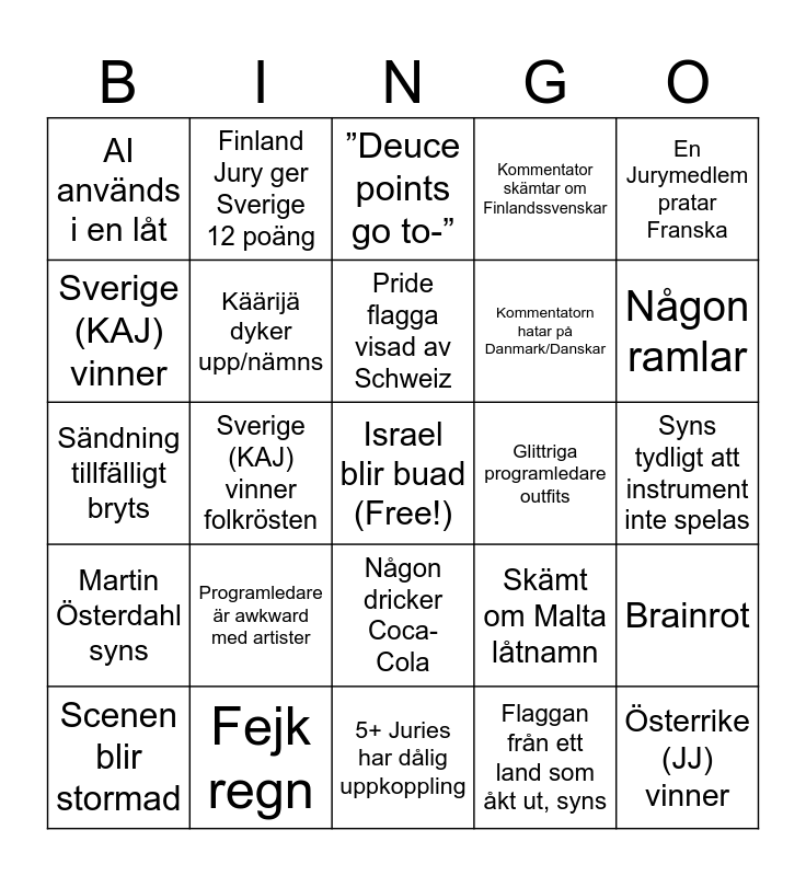 This bingo card has a free space and 46 words: Nemo/The Code är med, Österrike (JJ) vinner, UK får 0-10 poäng, 5+ Juries har dålig uppkoppling, Programledare är awkward med artister, Mer ESC2020 nummer Mellanakter, Finland Jury ger Sverige 12 poäng, Junior ESC referens/ mellanakt, Sverige (KAJ) vinner, Nederländerna (Claude) vinner, Käärijä dyker upp/nämns, Kommentator skämtar om Finlandssvenskar, Brainrot, Skämt om Malta låtnamn, Skämt om att de ”drog ner” på det sexuella, Loreen/Tattoo nämns, Pride flagga visad av Schweiz, Glittriga programledare outfits, Juryn säger ”Hello Switzerland”, En Jurymedlem pratar Franska, Sverige (KAJ) vinner folkrösten, Flaggan från ett land som åkt ut, syns, AI används i en låt, Kommentatorn hatar på Danmark/Danskar, Sandra sitter på Danmarks vägg, Någon ramlar, Scenen blir stormad, En artist blir diskad, Någon dricker Coca-Cola, Martin Österdahl syns, Nån river upp sin tröja/topp, Nån får en voicecrack, Joost Klein dyker upp/nämns, Någon nämner ABBA, Nån gråter, Fejk regn, Syns tydligt att instrument inte spelas, Jury börjar sjunga på låten de gav 12 poäng, Prop går sönder, Någon har på sig en hatt (vad skumt), Nån andas tungt i mikrofonen, ”Deuce points go to-”, Sändning tillfälligt bryts, Sångare flörtar med kameran, Artist har på sig en Pride flahha and Tommy Cash dricker kaffe i Green Room.