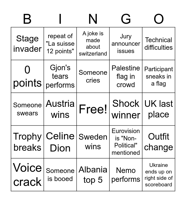 This bingo card has a free space and 24 words: Celine Dion, Someone is booed, Someone cries, Voice crack, Technical difficulties, Stage invader, 0 points, repeat of "La suisse 12 points", Shock winner, Sweden wins, Palestine flag in crowd, Someone swears, Eurovision is "Non-Political" mentioned, Outfit change, Gjon's tears performs, Nemo performs, UK last place, A joke is made about switzerland, Participant sneaks in a flag, Austria wins, Ukraine ends up on right side of scoreboard, Trophy breaks, Jury announcer issues and Albania top 5.