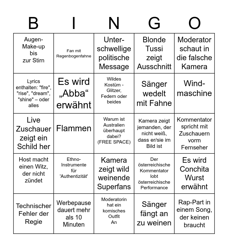 This bingo card has a free space and 24 words: Ethno-Instrumente für 'Authentizität', Werbepause dauert mehr als 10 Minuten, Wildes Kostüm - Glitzer, Federn oder beides, Technischer Fehler der Regie, Moderator schaut in die falsche Kamera, Augen-Make-up bis zur Stirn, Lyrics enthalten: "fire", "rise", "dream", "shine" – oder alles, Fan mit Regenbogenfahne, Kamera zeigt jemanden, der nicht weiß, dass er/sie im Bild ist, Kamera zeigt wild weinende Superfans, Sänger wedelt mit Fahne, Live Zuschauer zeigt ein Schild her, Der österreichische Kommentator lobt österreichische Performance, Es wird Conchita Wurst erwähnt, Es wird „Abba“ erwähnt, Sänger fängt an zu weinen, Kommentator spricht mit Zuschauern vorm Fernseher, Unter-schwellige politische Message, Wind-maschine, Flammen, Rap-Part in einem Song, der keinen braucht, Host macht einen Witz, der nicht zündet, Blonde Tussi zeigt Ausschnitt and Moderatorin hat ein komisches Outfit An.