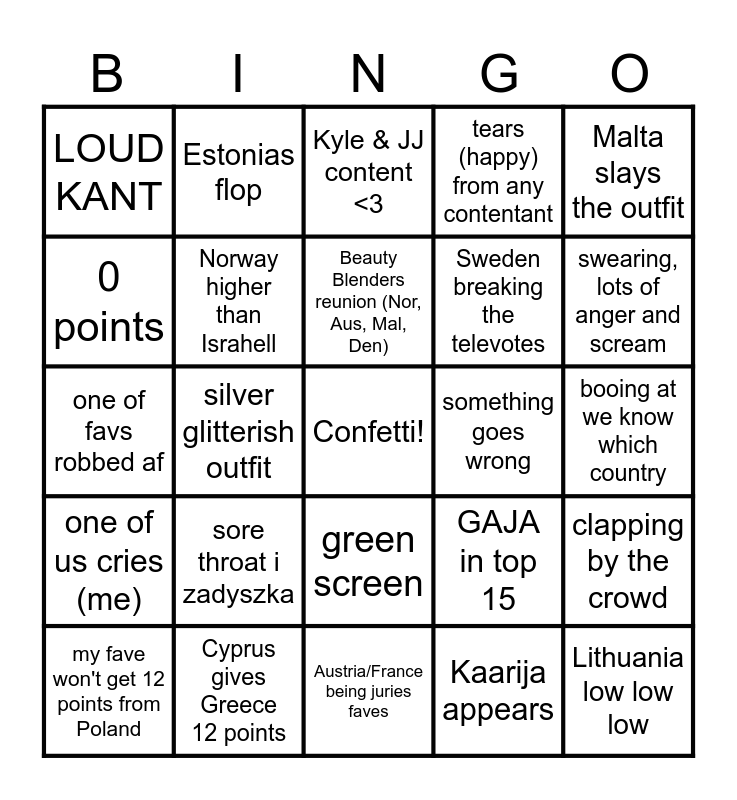 This bingo card has a free space and 24 words: my fave won't get 12 points from Poland, sore throat i zadyszka, Beauty Blenders reunion (Nor, Aus, Mal, Den), Kaarija appears, Malta slays the outfit, LOUD KANT, Estonias flop, Kyle & JJ content <3, something goes wrong, booing at we know which country, one of favs robbed af, Norway higher than Israhell, GAJA in top 15, clapping by the crowd, 0 points, Cyprus gives Greece 12 points, Austria/France being juries faves, tears (happy) from any contentant, swearing, lots of anger and scream, one of us cries (me), silver glitterish outfit, green screen, Sweden breaking the televotes and Lithuania low low low.