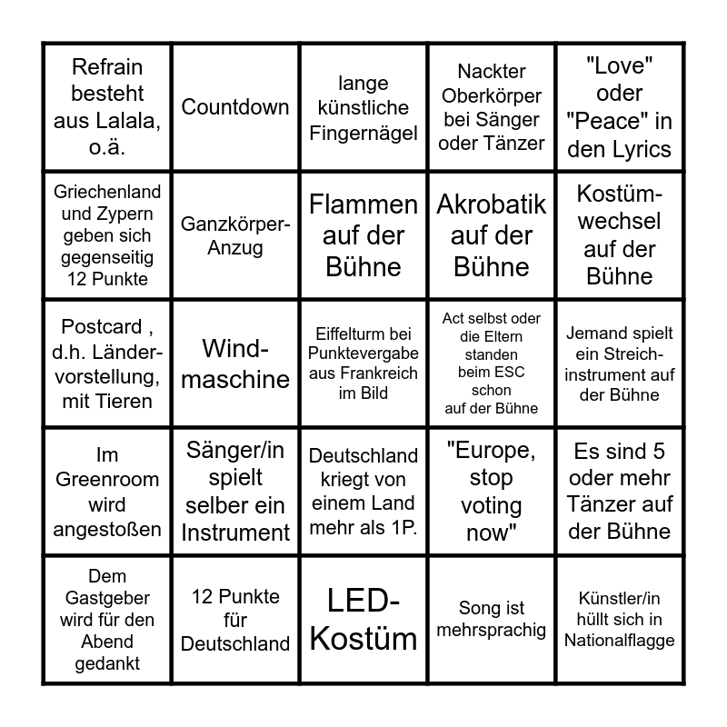 This bingo card has a free space and 49 words: Moderator/in hat sich umgezogen, Künstler/in hüllt sich in Nationalflagge, Traditionelles Kostüm / Tracht, LED-Kostüm, Sänger/in spielt selber ein Instrument, "[Country], can we have your votes, please?", Countdown, Handherzen für die Zuschauer, Griechenland und Zypern geben sich gegenseitig 12 Punkte, Nebel auf der Bühne, Ganzkörper- Anzug, Nackter Oberkörper bei Sänger oder Tänzer, Es sind 5 oder mehr Tänzer auf der Bühne, "Europe, stop voting now", Telefongeste in die Kamera, Punkte-vergabe wird erklärt, Flammen auf der Bühne, Act selbst oder die Eltern standen beim ESC schon auf der Bühne, Punkte-übermittler/in singt Lied (an), "Love" oder "Peace" in den Lyrics, Wind-maschine, Song ist mehrsprachig, Refrain besteht aus Lalala, o.ä., Akrobatik auf der Bühne, Jemand im Publikum hat eine Flaggen- Gesichts Bemalung, Kostüm-wechsel auf der Bühne, Dem Gastgeber wird für den Abend gedankt, Jemand trägt drinnen eine Sonnenbrille, Deutschland kriegt von einem Land mehr als 1P., Im Greenroom wird angestoßen, "Good Evening Europe good morning Australia", Sänger/in ist Barfuß, Jemand sagt „Grand Prix“, Thorsten Schorn macht einen zynischen Kommentar, 12 Punkte für Deutschland, Outfit aus Lack und Leder, Duett, Konfetti-Regen, Jemand spielt ein Streich-instrument auf der Bühne, Goldregen, Overknees, "You're good to go", Die Halle singt laut hörbar mit, Kußhände, Postcard , d.h. Länder-vorstellung, mit Tieren, lange künstliche Fingernägel, Sänger/in steht auf Podest oder ähnlichem, Sänger/in löst LED-Effekte auf Bühne aus and wie aus einem Horrorfilm.