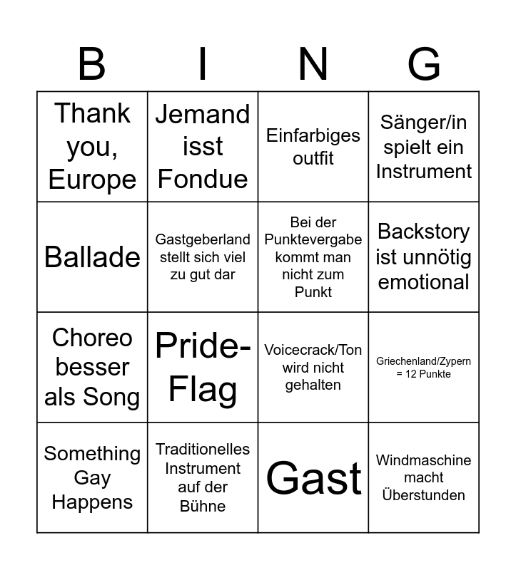 This bingo card has 18 words: Ballade, Traditionelles Instrument auf der Bühne, Einfarbiges outfit, Sänger/in spielt ein Instrument, Choreo besser als Song, Jemand isst Fondue, Voicecrack/Ton wird nicht gehalten, Backstory ist unnötig emotional, Thank you, Europe, Pride-Flag, Deutschland 0 points, Griechenland/Zypern = 12 Punkte, Something Gay Happens, Gastgeberland stellt sich viel zu gut dar, Bei der Punktevergabe kommt man nicht zum Punkt, Windmaschine macht Überstunden, Gast and Choreo besser als Song.