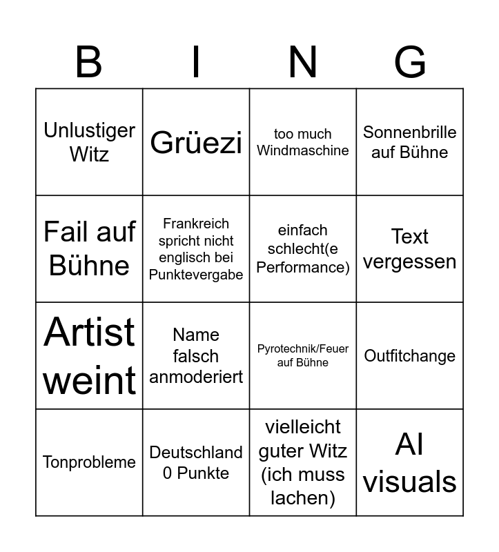 This bingo card has 16 words: Deutschland 0 Punkte, Outfitchange, too much Windmaschine, Unlustiger Witz, Artist weint, Grüezi, Pyrotechnik/Feuer auf Bühne, vielleicht guter Witz (ich muss lachen), Fail auf Bühne, Frankreich spricht nicht englisch bei Punktevergabe, Tonprobleme, Sonnenbrille auf Bühne, Name falsch anmoderiert, Text vergessen, einfach schlecht(e Performance) and AI visuals.