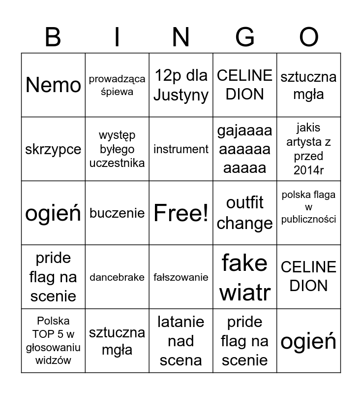 This bingo card has a free space and 39 words: postawiony aplauz, płacz, Justyna nie może wyjść z liny, występ byłego uczestnika, Polska TOP 5 w głosowaniu widzów, fałszowanie, instrument, 12p dla Justyny, sztuczna mgła, pride flag na scenie, buczenie, CELINE DION, ogień, polska flaga w publiczności, outfit change, dancebrake, 0p od widzów, Nemo, problemy techniczne, fake wiatr, skrzypce, latanie nad scena, gajaaaa aaaaaa aaaaa, jakis artysta z przed 2014r, postawiony aplauz, płacz, Justyna nie może wyjść z liny, występ byłego uczestnika, Polska TOP 5 w głosowaniu widzów, prowadząca śpiewa, fałszowanie, instrument, 12p dla Justyny, sztuczna mgła, pride flag na scenie, buczenie, CELINE DION, ogień and polska flaga w publiczności.