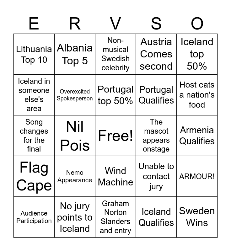 This bingo card has a free space and 24 words: Nemo Appearance, No jury points to Iceland, Portugal top 50%, Audience Participation, Iceland top 50%, Lithuania Top 10, Iceland in someone else's area, Albania Top 5, The mascot appears onstage, Wind Machine, Portugal Qualifies, Song changes for the final, Unable to contact jury, ARMOUR!, Overexcited Spokesperson, Iceland Qualifies, Armenia Qualifies, Non-musical Swedish celebrity, Host eats a nation's food, Nil Pois, Sweden Wins, Flag Cape, Austria Comes second and Graham Norton Slanders and entry.