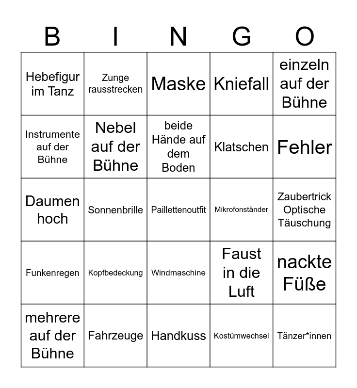 This bingo card has 25 words: Kopfbedeckung, Handkuss, beide Hände auf dem Boden, mehrere auf der Bühne, einzeln auf der Bühne, Hebefigur im Tanz, Instrumente auf der Bühne, Zunge rausstrecken, Mikrofonständer, Windmaschine, Klatschen, Daumen hoch, Faust in die Luft, nackte Füße, Nebel auf der Bühne, Tänzer*innen, Zaubertrick Optische Täuschung, Maske, Fehler, Sonnenbrille, Paillettenoutfit, Fahrzeuge, Funkenregen, Kniefall and Kostümwechsel.