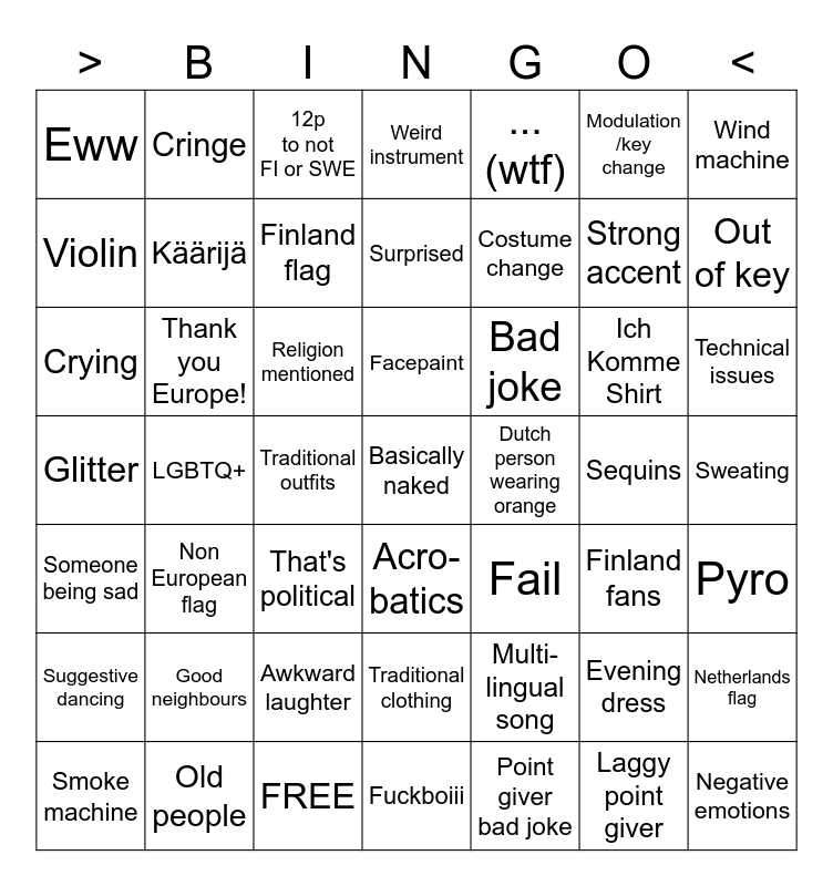This bingo card has a free space and 48 words: Multi-lingual song, Strong accent, Fuckboiii, LGBTQ+, Religion mentioned, Sweating, Cringe, Old people, Modulation /key change, Acro- batics, Wind machine, Weird instrument, Ich Komme Shirt, Bad joke, Suggestive dancing, Sequins, Violin, Out of key, Evening dress, ... (wtf), Costume change, Traditional outfits, Eww, Käärijä, Netherlands flag, Finland flag, Technical issues, Smoke machine, Facepaint, Thank you Europe!, Laggy point giver, Dutch person wearing orange, Pyro, Good neighbours, Glitter, Fail, Finland fans, Crying, That's political, Awkward laughter, Someone being sad, Negative emotions, 12p to not FI or SWE, FREE, Surprised, Traditional clothing, Non European flag and Point giver bad joke.