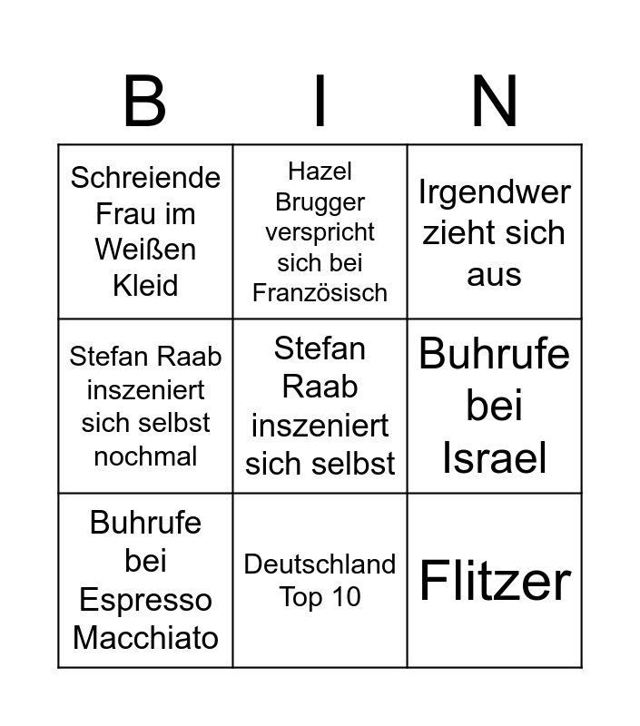 This bingo card has a free space and 8 words: Buhrufe bei Israel, Irgendwer zieht sich aus, Hazel Brugger verspricht sich bei Französisch, Buhrufe bei Espresso Macchiato, Schreiende Frau im Weißen Kleid, Flitzer, Stefan Raab inszeniert sich selbst nochmal and Deutschland Top 10.