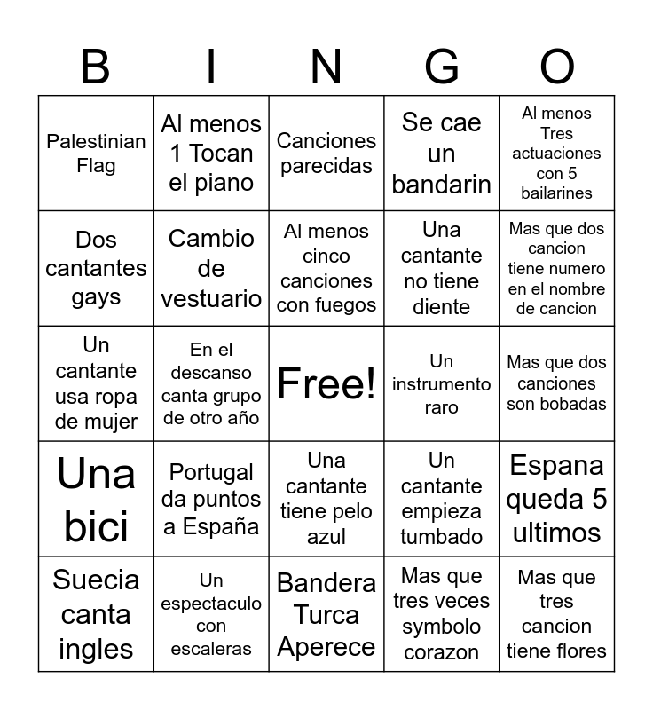 This bingo card has a free space and 24 words: Portugal da puntos a España, Un espectaculo con escaleras, Al menos cinco canciones con fuegos, Suecia canta ingles, Al menos Tres actuaciones con 5 bailarines, Palestinian Flag, Dos cantantes gays, Al menos 1 Tocan el piano, Un instrumento raro, Una cantante tiene pelo azul, Una cantante no tiene diente, Un cantante usa ropa de mujer, Un cantante empieza tumbado, Espana queda 5 ultimos, Cambio de vestuario, Mas que tres veces symbolo corazon, Mas que dos canciones son bobadas, Canciones parecidas, Mas que dos cancion tiene numero en el nombre de cancion, En el descanso canta grupo de otro año, Mas que tres cancion tiene flores, Una bici, Se cae un bandarin and Bandera Turca Aperece.