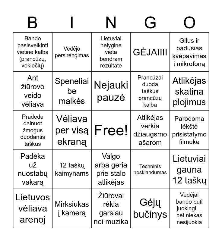 This bingo card has a free space and 24 words: 12 taškų kaimynams, Mirksiukas į kamerą, Nejauki pauzė, Lietuvos vėliava arenoj, Gilus ir padusias kvėpavimas į mikrofoną, Bando pasisveikinti vietine kalba (prancūzų, vokiečių), Ant žiūrovo veido vėliava, Vedėjo persirengimas, Atlikėjas verkia džiaugsmo ašarom, Valgo arba geria prie stalo atlikėjas, Prancūzai duoda taškus prancūzų kalba, Pradeda dainuot žmogus duodantis taškus, Techninis nesklandumas, Lietuviai gauna 12 taškų, Speneliai be maikės, Gėjų bučinys, Parodoma lėkštė prisistatymo filmuke, Lietuviai nelygine vieta bendram rezultate, Atlikėjas skatina plojimus, Vėliava per visą ekraną, Vedėjai bando būti juokingi… bet niekas nesijuokia, Padėka už nuostabų vakarą, GĖJAIIII and Žiūrovai rėkia garsiau nei muzika.