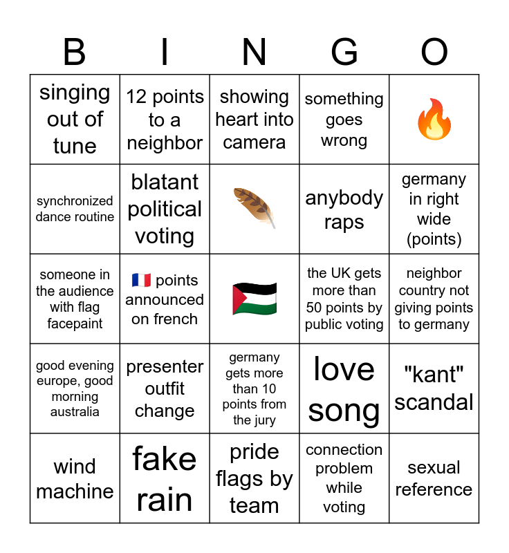 This bingo card has a free space and 24 words: presenter outfit change, fake rain, 🪶, wind machine, 🔥, singing out of tune, synchronized dance routine, 12 points to a neighbor, the UK gets more than 50 points by public voting, germany gets more than 10 points from the jury, anybody raps, someone in the audience with flag facepaint, love song, "kant" scandal, blatant political voting, connection problem while voting, neighbor country not giving points to germany, showing heart into camera, germany in right wide (points), 🇫🇷 points announced on french, sexual reference, good evening europe, good morning australia, something goes wrong and pride flags by team.