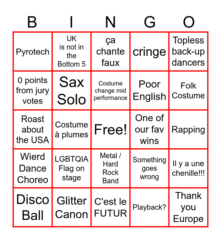 This bingo card has a free space and 24 words: LGBTQIA Flag on stage, Glitter Canon, Costume change mid performance, Disco Ball, Topless back-up dancers, Pyrotech, 0 points from jury votes, UK is not in the Bottom 5, One of our fav wins, Metal / Hard Rock Band, Poor English, Roast about the USA, Something goes wrong, Il y a une chenille!!!, Sax Solo, Playback?, Rapping, ça chante faux, Folk Costume, Costume à plumes, Thank you Europe, Wierd Dance Choreo, cringe and C'est le FUTUR.