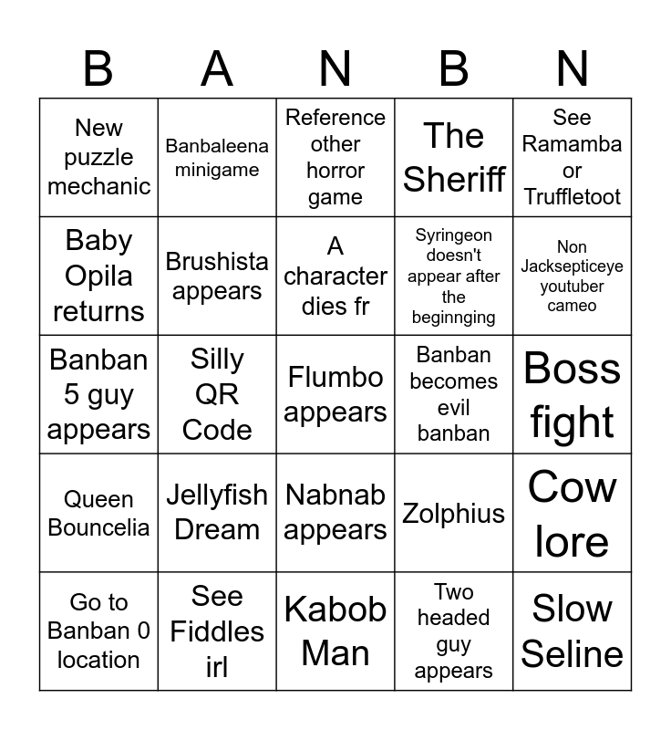 This bingo card has a free space and 24 words: Jellyfish Dream, See Fiddles irl, A character dies fr, Go to Banban 0 location, See Ramamba or Truffletoot, New puzzle mechanic, Baby Opila returns, Banbaleena minigame, Banban becomes evil banban, Nabnab appears, Syringeon doesn't appear after the beginnging, Banban 5 guy appears, Zolphius, Cow lore, Brushista appears, Two headed guy appears, Boss fight, Reference other horror game, Non Jacksepticeye youtuber cameo, Silly QR Code, Slow Seline, Queen Bouncelia, The Sheriff and Kabob Man.