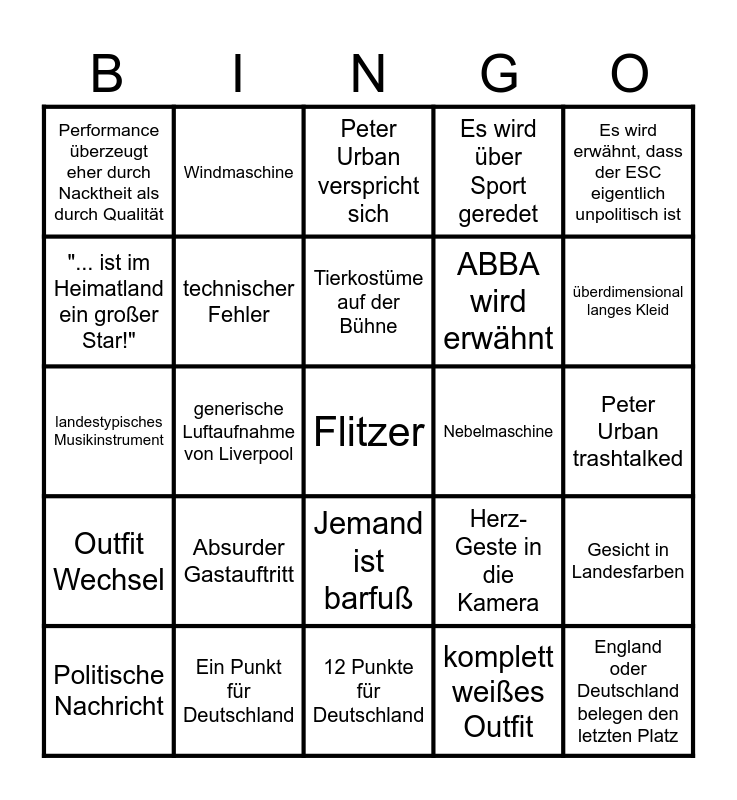 This bingo card has 35 words: Es wird zum 3. Mal erwähnt, dass Peter Urban aufhört, Song, in dem mindestens zwei Sprachen vorkommen, Urban sagt etwas sexistisches oder rassistisches, ABBA wird erwähnt, England oder Deutschland belegen den letzten Platz, Performance überzeugt eher durch Nacktheit als durch Qualität, technischer Fehler, Jemand macht eine Telefongeste in die Kamera, Nebelmaschine, Spanien überzeugt eher durch Nacktheit als durch Qualität, landestypisches Musikinstrument, Windmaschine, Jemand ist barfuß, Lord of the Lost wird mit Maneskin verglichen, Es wird erwähnt, dass der ESC eigentlich unpolitisch ist, Outfit Wechsel, Ein Punkt für Deutschland, Peter Urban verspricht sich, komplett weißes Outfit, Peter Urban trashtalked, Politische Nachricht, generische Luftaufnahme von Liverpool, Flitzer, Epic Blasinstrument-Solo, überdimensional langes Kleid, "... ist im Heimatland ein großer Star!", Pyrotechnik auf der Bühne, 12 Punkte für Deutschland, Herz-Geste in die Kamera, Gesicht in Landesfarben, Es wird eine Burg gezeigt, Absurder Gastauftritt, Tierkostüme auf der Bühne, Es wird über Sport geredet and Es wird erklärt, warum Australien teilnimmt.